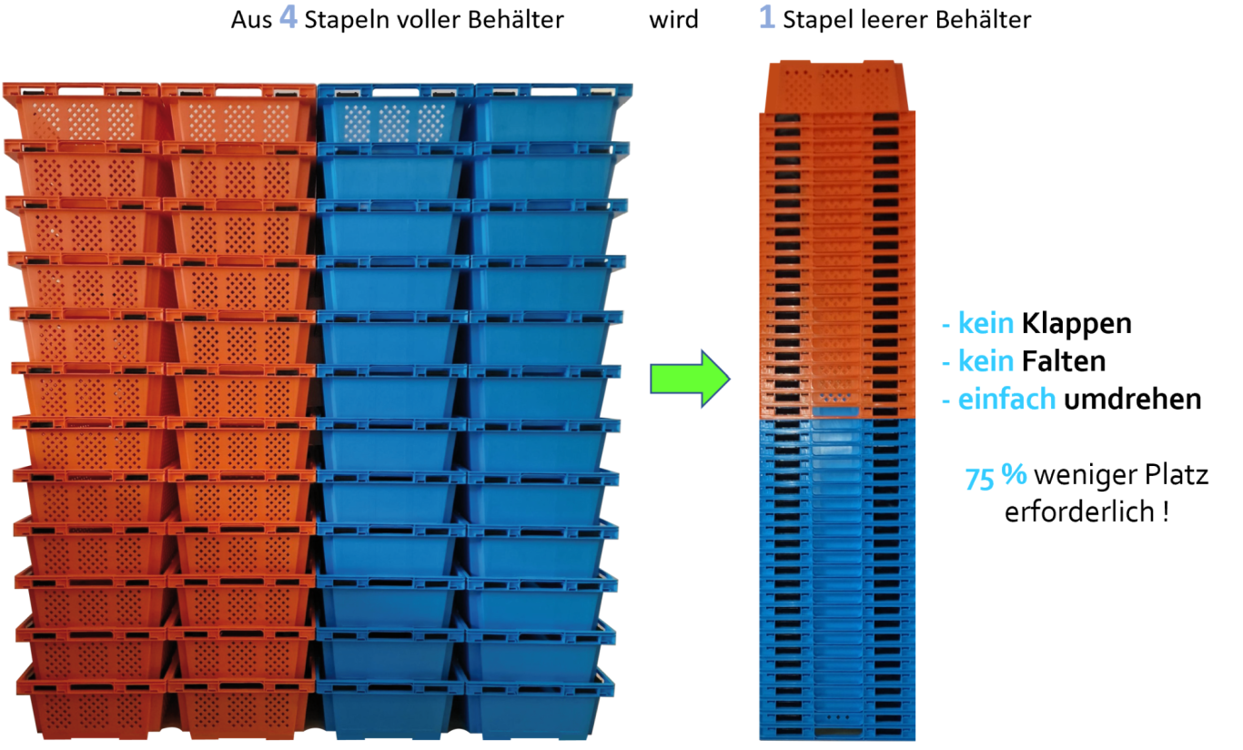 Durch das einfache Umdrehen der Behälter können Sie beeindruckende 75 % Platz sparen, wenn sie leer sind. Unsere Lösung ist nicht nur platzsparend, sondern reduziert die Kosten für Transport und Lagerung erheblich !
